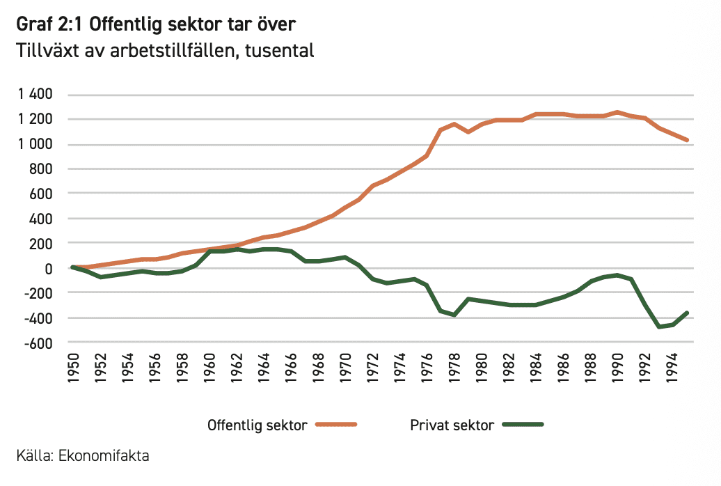 Ur ett ekonomiskt perspektiv förändrades Sverige under decennierna som ledde fram till den reformvåg som inleddes i mitten av 1980-talet. Man kan beskriva utvecklingen genom att titta på var jobben skapades någonstans. Under denna period växte offentlig sektor drastiskt, medan näringslivet gick tillbaka. År 1995 var antalet anställda i företagen 364 000 färre än 1950. Detta samtidigt som den arbetsföra befolkningen ökade med 800 000 och jobben i offentlig sektor ökade med över en miljon.