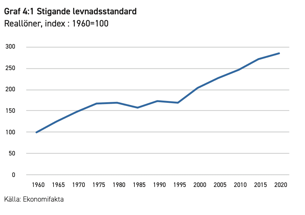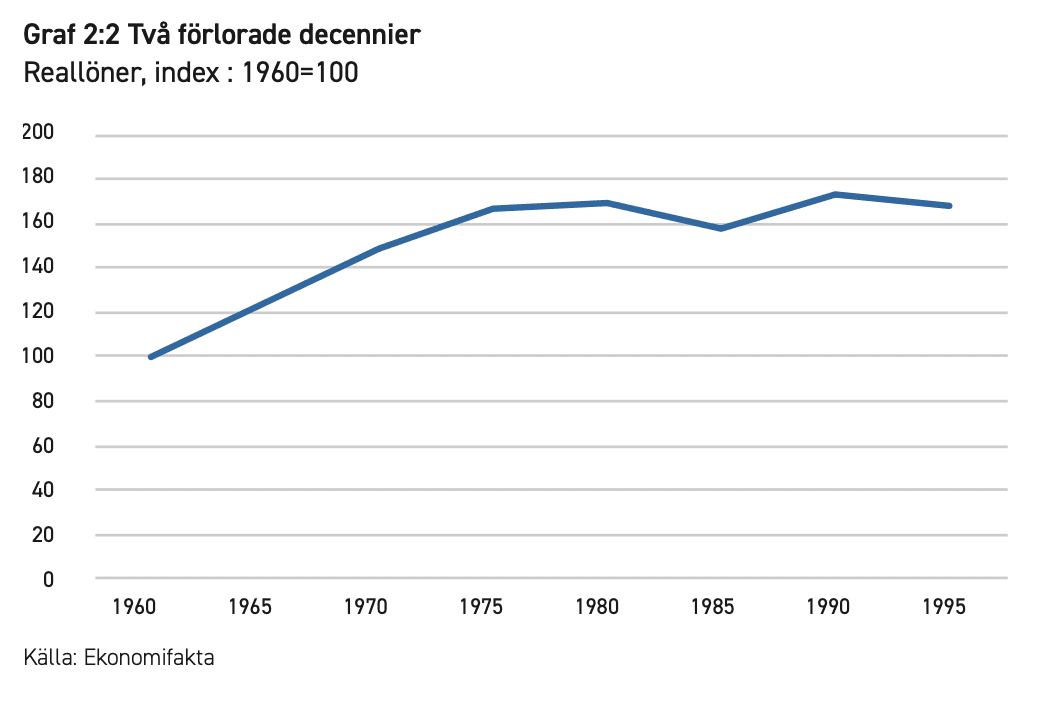 Under lång tid hade svenskarna upplevt en stigande levnadsstandard. Bara mellan 1960 och 1975 hade reallönerna ökat med 66,5 procent. Men nu tog det stopp, med en stagnation som varade i två hela decennier. 1995 var reallönerna på samma nivå som 1975.