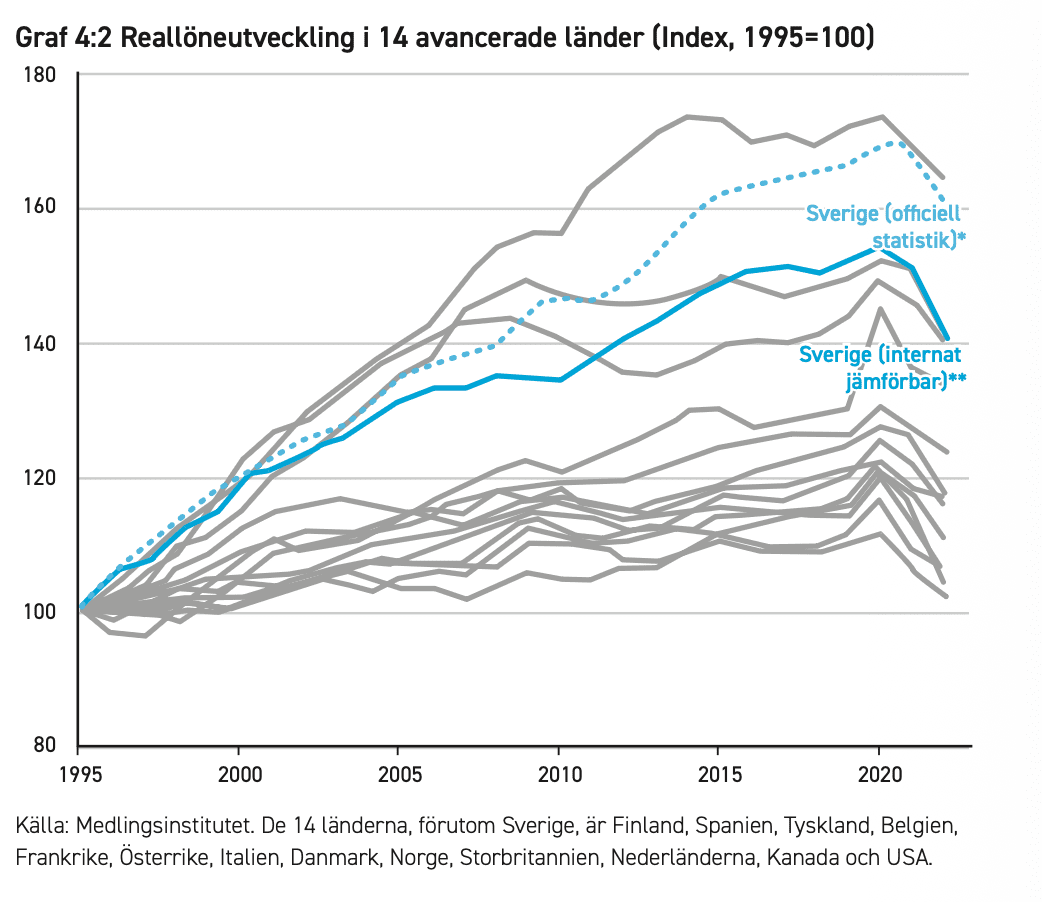 Här sägs det ibland att nedgången i svensk ekonomi under 1970- och 1980-talen främst var en del av internationella händelser – oljekrisen och ökad konkurrens för varvs- respektive tekoindustrin – och att andra länder genomgick en liknande utveckling. Det internationella spelade visserligen in, men utvecklingen i Sverige stack ut. Vi stagnerade även i förhållande till jämförbara länder. Det ser man inte minst om man tittar på utvecklingen av reallöner.
