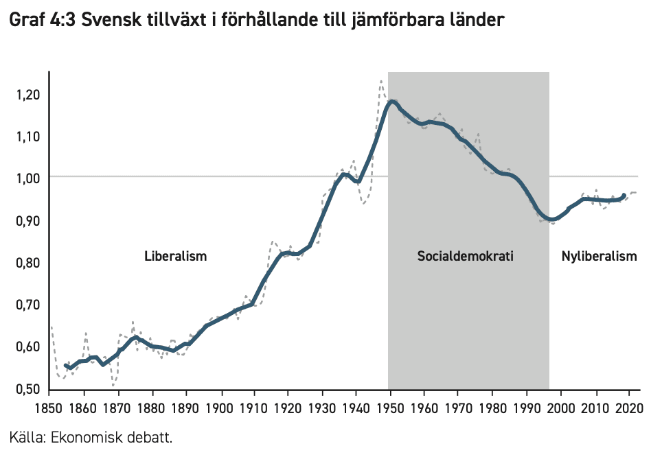 Kurvan i Graf 4:3 anger kvoten mellan svensk BNP per capita och medelvärdet för BNP per capita i femton jämförbara länder. Vid värden under ett är svensk BNP per capita lägre än omvärldens och tvärtom. Jonung anger i sin artikel (och i grafen) tre perioder som han kallar liberalism, socialdemokrati respektive nyliberalism. Detta är inte beteckningar på något politiskt parti, utan på den allmänna inriktningen på samhällsutvecklingen och politiken. När Sverige har bedrivit liberal politik har vi vuxit snabbare än andra länder, och när politiken har präglats av socialdemokrati har vi vuxit långsammare. Mellan 1950 och 2000 växte Sverige alltså långsammare. Men de senaste två decennierna har utvecklingen vänt och vi har återigen börjat växa snabbare än jämförbara länder.