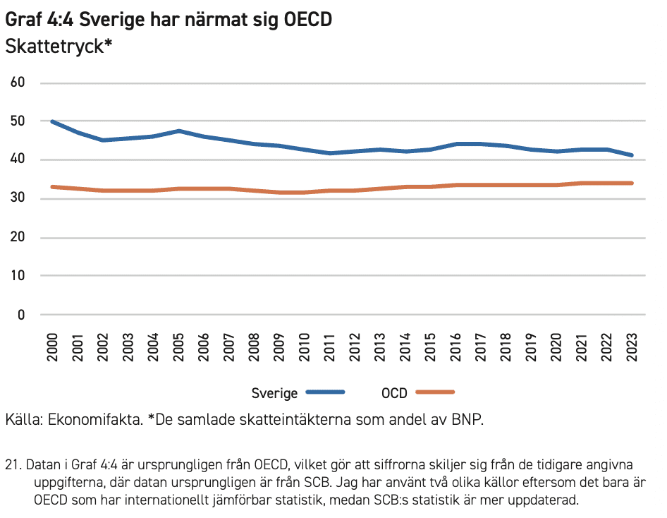 [21] Datan i Graf 4:4 är ursprungligen från OECD, vilket gör att siffrorna skiljer sig från de tidigare angivna uppgifterna, där datan ursprungligen är från SCB. Jag har använt två olika källor eftersom det bara är OECD som har internationellt jämförbar statistik, medan SCB:s statistik är mer uppdaterad.