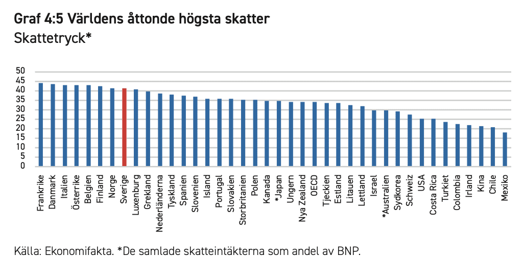 Som vi ser i graf 4:4 nedan har vi fortfarande en bit kvar ner till OECD-snittet.[21] Men den åtminstone tidigare så vanliga frasen att Sverige har världens högsta skatter stämmer inte längre. I OECD:s lista över skatteintäkternas andel av BNP ligger vi numera först på åttonde plats, 2,4 procentenheter bakom ”ettan” Frankrike.