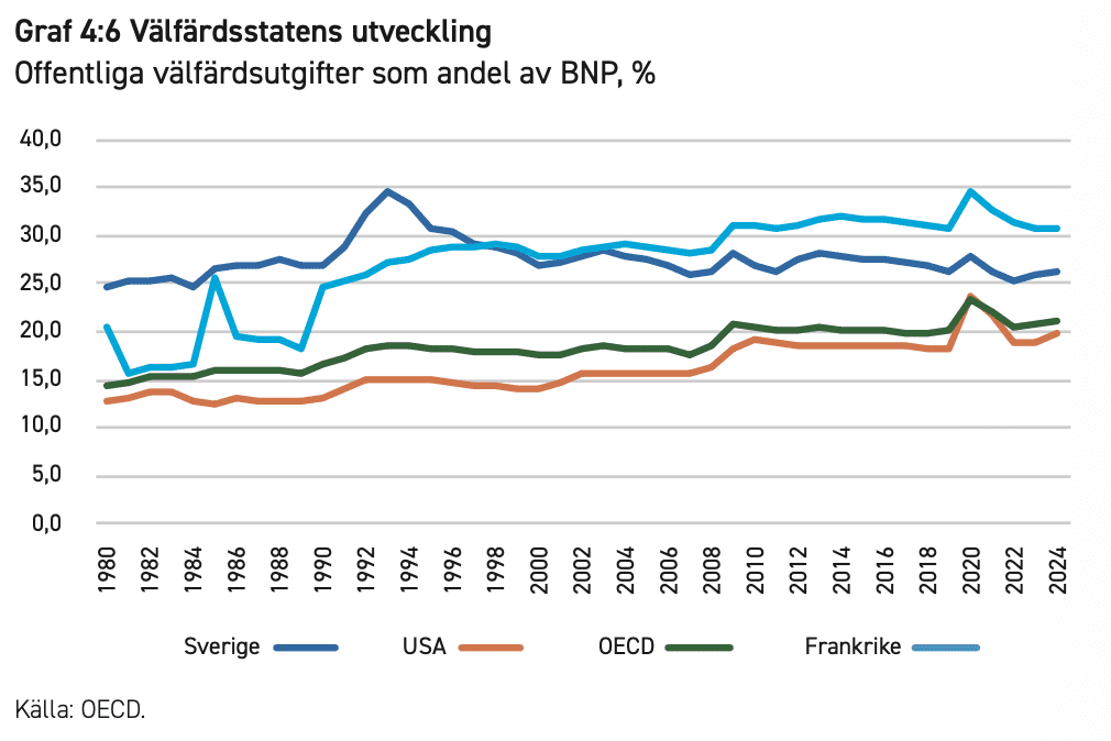 Eftersom en stor del av de samlade skatteintäkterna går till välfärden, kommer utvecklingen av de offentliga välfärdsutgifterna som andel av BNP delvis att återspegla skattetryckets utveckling. I graf 4:6 ser vi hur det sett ut sedan 1980, i Sverige, USA och Frankrike samt i OECD som helhet.
