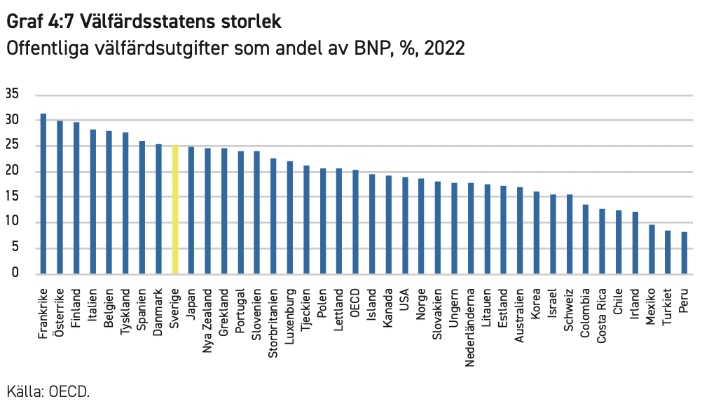 Det är också intressant att titta på de svenska offentliga välfärdsutgifterna i relation till andra länder. Då ser vi för det första att Frankrike har bytt plats med Sverige när det gäller välfärdsstatens storlek. Samtidigt har den offentliga välfärden i såväl USA som OECD som helhet utökat sin andel av BNP. Sverige ligger mitt emellan Frankrike och OECD-snittet.