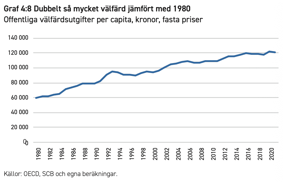 Det är dock viktigt att påminna om att välfärdsutgifterna år 2024 (26,1 procent) utgjorde en större andel av BNP idag än 1980 (24,5 procent). Till det kommer att BNP är 2,3 gånger större än 1980. Vi har visserligen blivit fler, men även utslaget per invånare är ekonomin större. BNP per capita är 1,8 gånger högre än 1980. Vi har alltså långt mer resurser till offentlig välfärd idag än 1980.