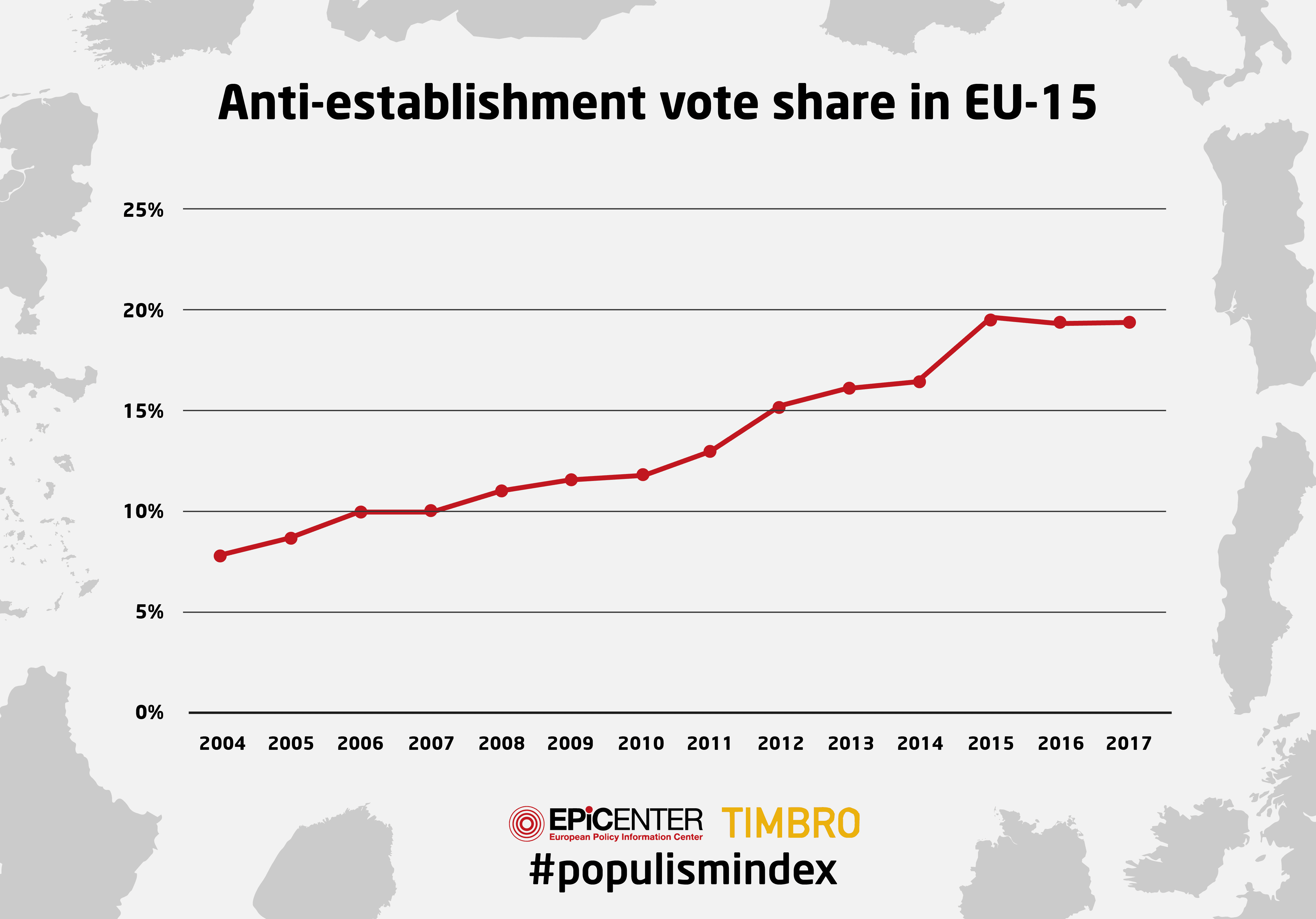 The 2017 Timbro Authoritarian Populism Index is the only Europe-wide comprehensive study that aims to shed light on whether populism poses a long-term threat to European liberal democracies. The Index explores the rise of authoritarian populism in Europe by analysing electoral data from 1980 to the summer 2017. As data show, Authoritarian-Populism has overtaken Liberalism and has now established itself as the third ideological force in European politics, behind Conservatism/Christian Democracy and Social Democracy. Hungary, Poland and Greece are the European countries where anti-establishment parties are the strongest. At the same time, nine European countries (including seven EU Member States) have populist parties in government. On average, around a fifth of the European electorate now vote for a left- or right-wing populist party. In other words, 55.8 million people voted for this parties during each European country’s latest general elections.