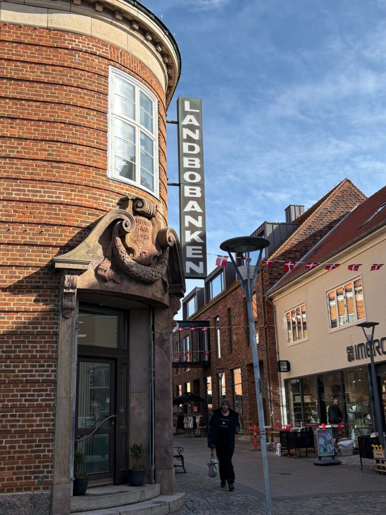 Ringkøbing och Skjern är båda exempel på precis den typen av platser. De är borgerligt småskaliga, med levande stadskärnor och där den lokala banken fortfarande har en framträdande roll på torget. I Ringkøbing heter den Landbobanken, och har rykte om sig att vara en av Danmarks mest välskötta. Med ingången till bankkontoret på hörnet av huset – precis som i fiktionens Korsbæk – söker sig tankarna naturligt till Mads Skjerns skapelse ”Omegnsbanken”.