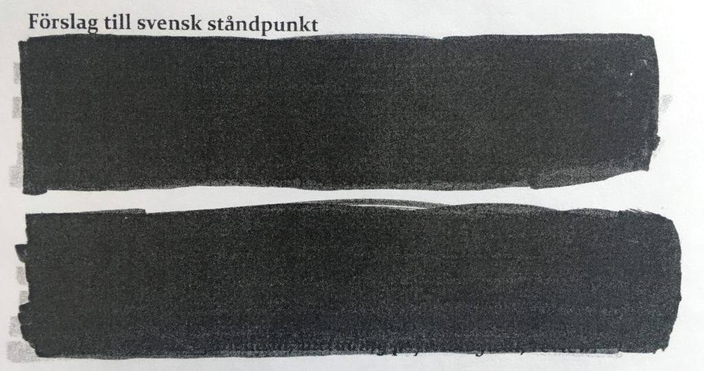 Ett annat dokument som har cirkulerat på nätet är en instruktion till Sveriges Genval-förhandlare inför ett möte i början av februari. Instruktionerna handlar om vilka ståndpunkter Sverige ska driva. Man kunde vänta sig en upprepning av vad riksdagen hade beslutat. I stället är flera stycken maskade, så att texten inte går att läsa.