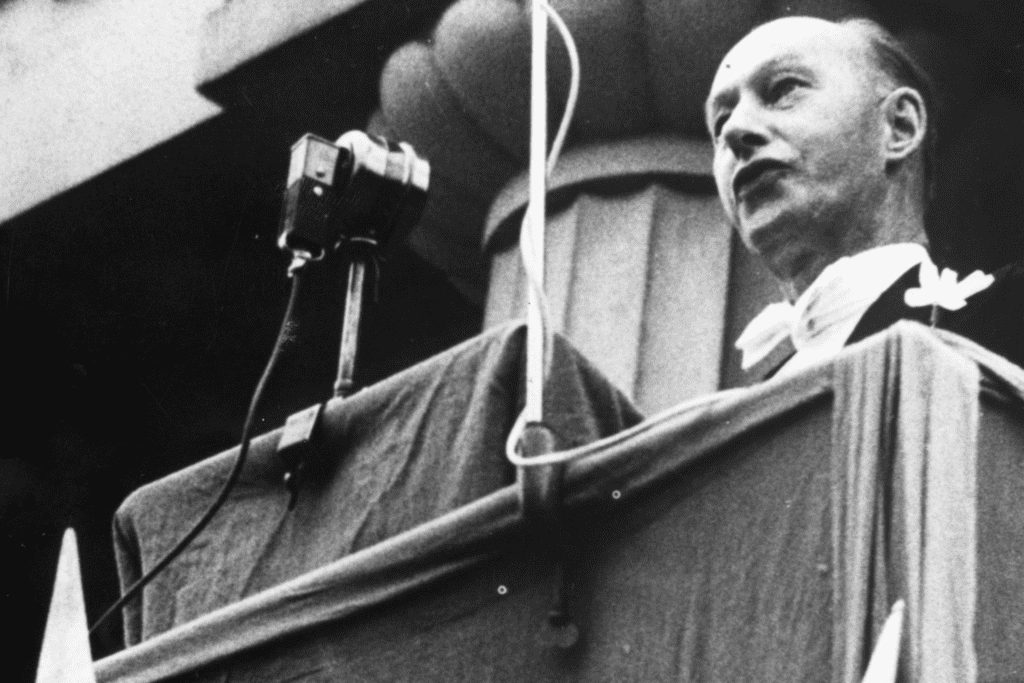 Bakgrunden till Johnsons uppmärksammade tal var det begynnande kalla kriget och Pragkuppen 1948, då kommunisterna i Tjeckoslovakien tog över landets koalitionsregering. En man, utrikesministern Jan Masaryk, vägrade avgå och underkasta sig kommunisternas påtryckningar. Han kvarstod som minister i några veckor tills han hittades död på utrikesministeriets gårdsplan precis nedanför sitt badrumsfönster.