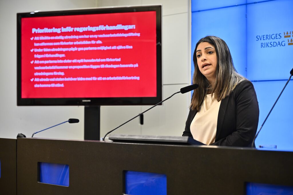 Vänsterpartiets ledare Nooshi Dadgostar presenterar prioriteringar inför eventuella regeringsförhandlingar vid en pressträff tidigare i år. Foto: Anders Wiklund/TT