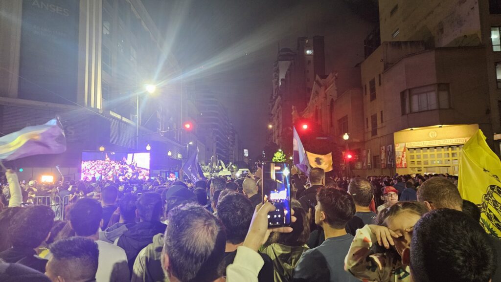 De hundratals personerna utanför hotellet utbryter återkommande i slagord som ”Libertad! Libertad! Libertad!” och ”Argentina sin Cristina” eller sjunger ramsan ”Milei du älskade, ditt folk är med dig” medan de väntar på att presidenten ska dyka upp på storbildskärmar utanför hotellet. Till slut gör han det.