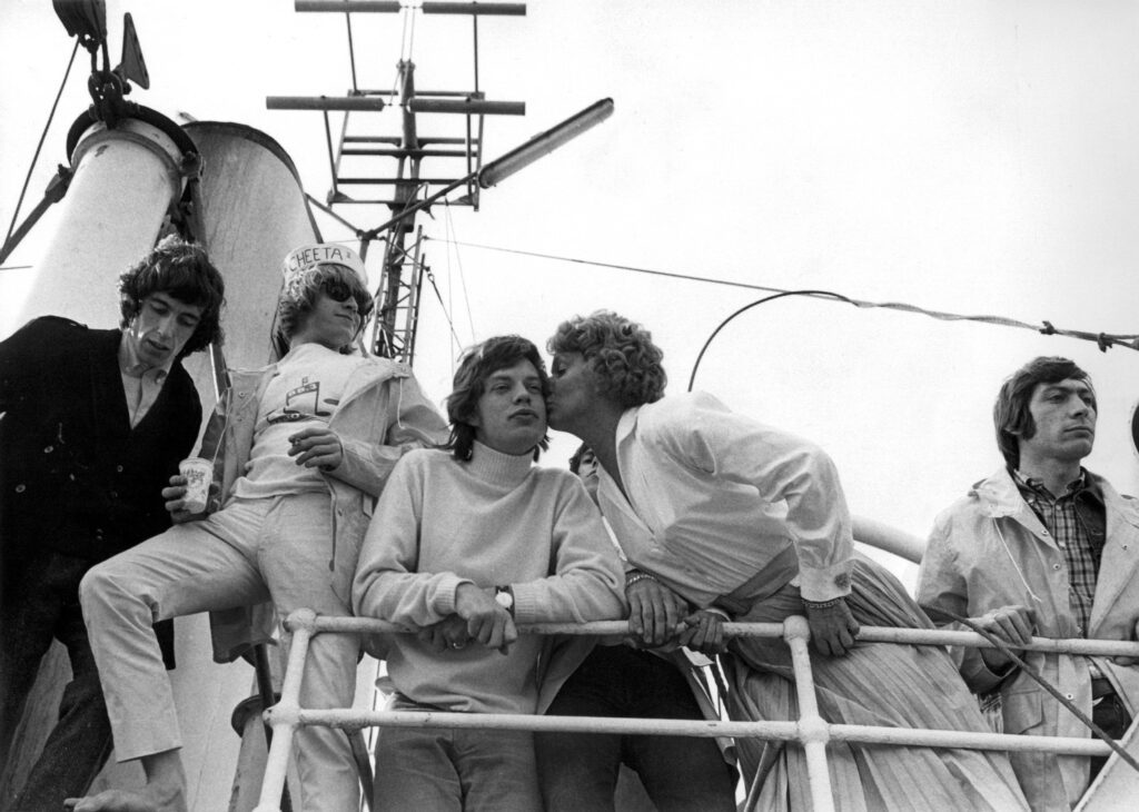 Sångaren i Rolling Stones får en puss på kinden av piratradiodrottningen Britt Wadner under gruppens besök på Radio Syd-fartyget i slutet av juni 1965. Foto: Scanpix