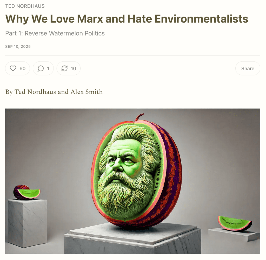Men i själva verket är vattenmelonen omvänd, skriver Nordhaus och Smith. Det är de förmenta socialisterna som är röda på utsidan men som de senaste decennierna förlorat sin kärna till en antimodern och tillväxtfientlig grön ideologi. Socialisterna brukade en gång vara modernitetens främsta förespråkare. De ekonomiska framstegen som kapitalismen genererade skulle användas för att förbättra arbetarklassens villkor och tillvaro. Konsumtion, det vill säga välståndshöjande varor och tjänster, var något bra som skulle spridas till fler. Det gällde även den svenska socialdemokratin. Vänstern ville förstås gärna styra ekonomin och kontrollera företagen på ett eller annat sätt, men utgångspunkten var att det skulle leda till ökad tillväxt snarare än tvärtom.